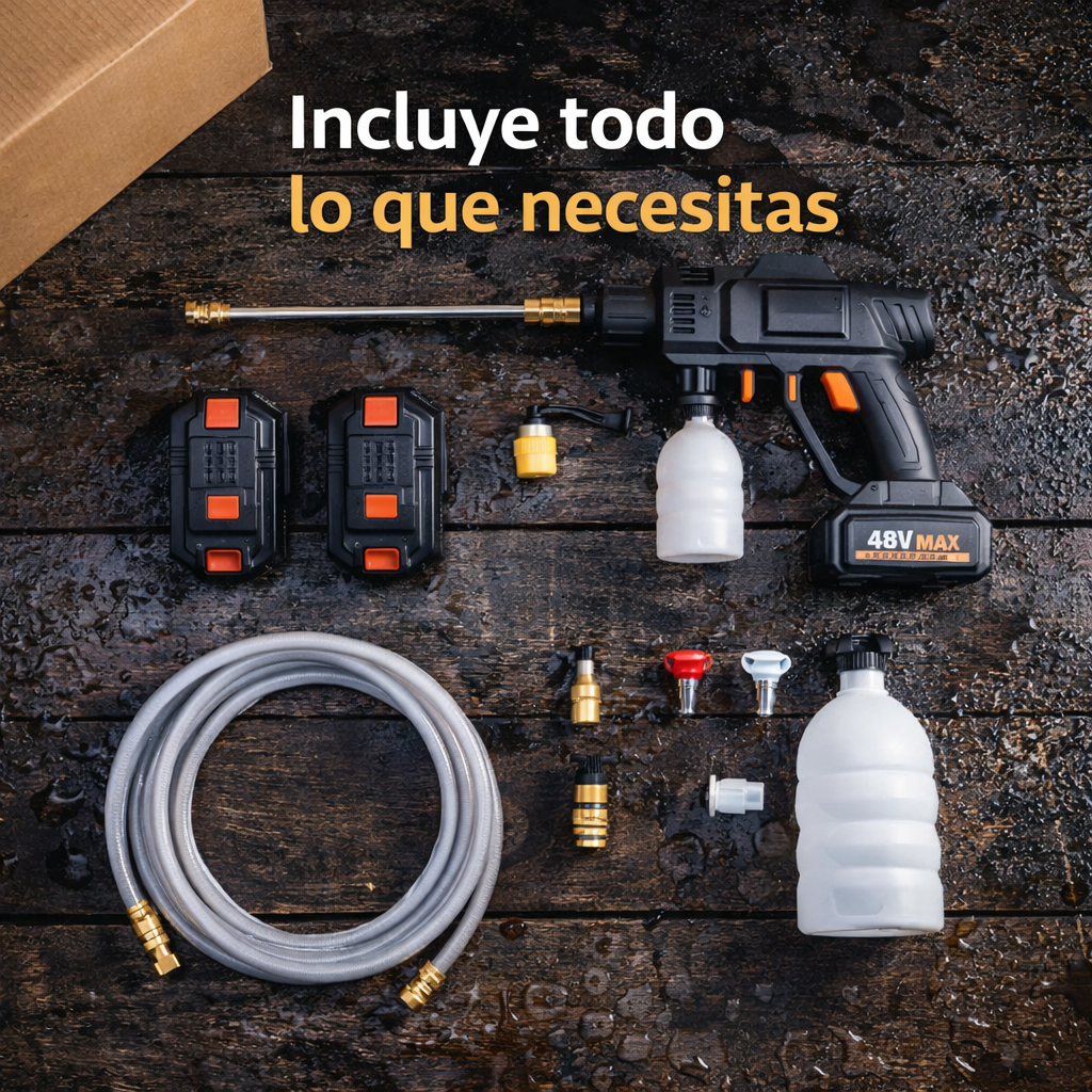 Incluye 2 baterías recargables de 48V. La duración depende del tipo de uso y presión aplicada, pero están pensadas para limpiezas de mantenimiento doméstico.