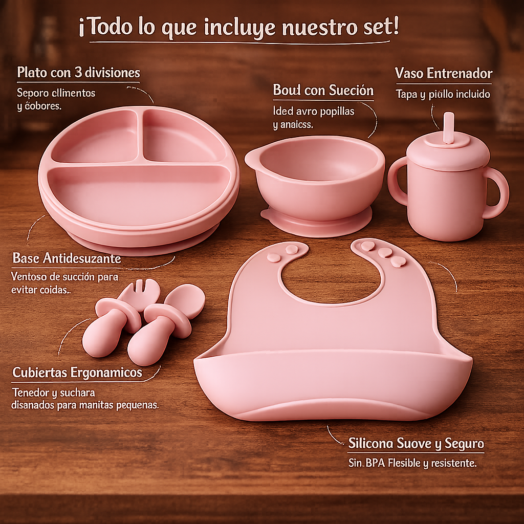 Plato dividido para separar alimentos, bowl con succión para mayor estabilidad, cubiertos ergonómicos y babero con bolsillo que reduce el desorden.